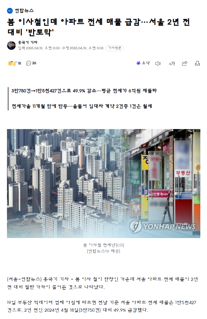 봄 이사철인데 아파트 전세 매물 급감…서울 2년 전 대비 '반토막'