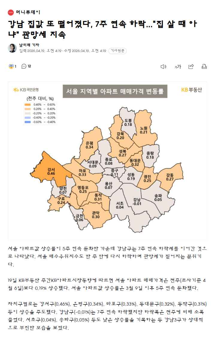 강남 집값 또 떨어졌다, 7주 연속 하락..."집 살 때 아냐" 관망세 지속